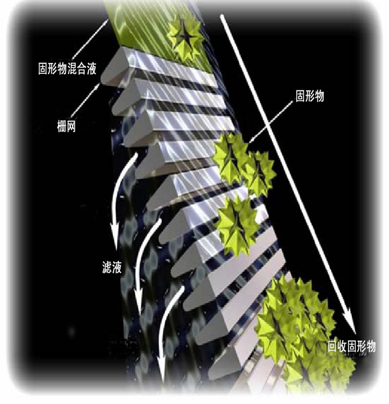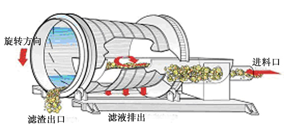 废水进入转鼓栅网内,转鼓与水发生“回转剪切”效应使滤液与转鼓的相对流速增加,实现更好的分离。滤液从栅缝中流出,滤渣由刮渣板将滤渣推至排渣口自动排出。